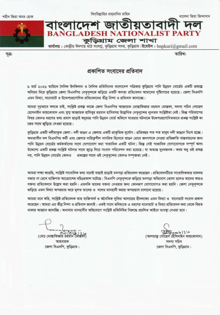 কুড়িগ্রাম জেলা বিএনপির প্রতিবাদ: পানি উন্নয়ন বোর্ড প্রকল্পে নেতাদের জড়ানোর অভিযোগ ভিত্তিহীন