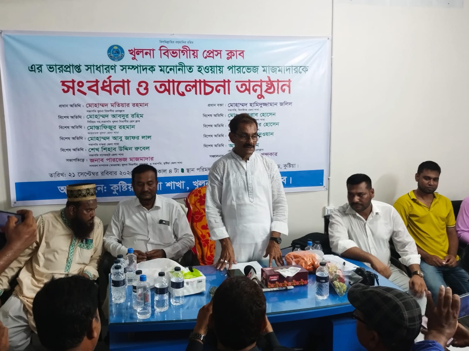 খুলনা বিভাগীয় প্রেস ক্লাবের ভারপ্রাপ্ত সাধারণ সম্পাদক হিসেবে দায়িত্বপ্রাপ্ত হওয়ায় কুষ্টিয়ার সাংবাদিক পারভেজ মাজমাদারকে সংবর্ধনা ও আলোচনা অনুষ্ঠান অনুষ্ঠিত হয়েছে। রোববার (২১ সেপ্টেম্বর ২০২৫) বিকেল ৪টায় কুষ্টিয়া শহরের এন.এস. রোডস্থ পরিমল টাওয়ারের ৪র্থ তলায় জেলা শাখার আয়োজনে এ অনুষ্ঠান হয়।