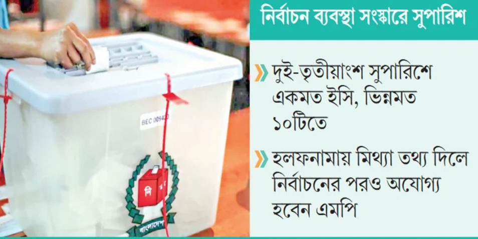 এমনকি নির্বাচন ব্যবস্থা সংস্কার কমিশনের দুই-তৃতীয়াংশের বেশি সুপারিশের সঙ্গে একমত হয়েছে কমিশন। সঙ্গে সংস্কার কমিশনের মোট ৩৫ সুপারিশের মধ্যে ২৫টির সঙ্গে একমত এবং বাকি ১০টির সঙ্গে ভিন্নমত জানিয়েছে ইসি। সম্প্রতি এ সংক্রান্ত সুপারিশ কার্যকরের জন্য সরকারের আইন ও সংসদ বিভাগে এই প্রস্তাব পাঠায় ইসি।