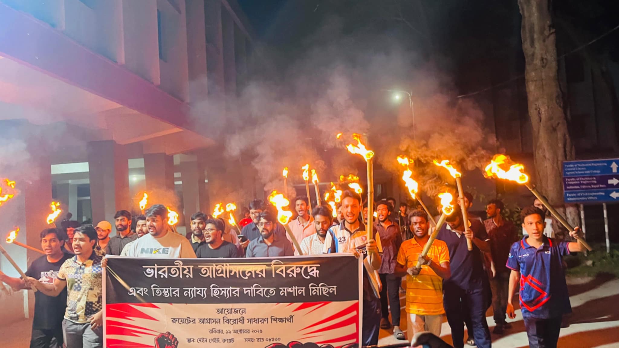 রাজশাহী প্রকৌশল ও প্রযুক্তি বিশ্ববিদ্যালয়ে (রুয়েট) তিস্তা নদীর ন্যায্য পানিবণ্টনের দাবি, ভারতীয় আগ্রাসনের প্রতিবাদ এবং উত্তরাঞ্চলের মানুষের প্রতি বৈষম্যের অবসানের প্রত্যাশায় এক শান্তিপূর্ণ মশাল মিছিল অনুষ্ঠিত হয়েছে।
