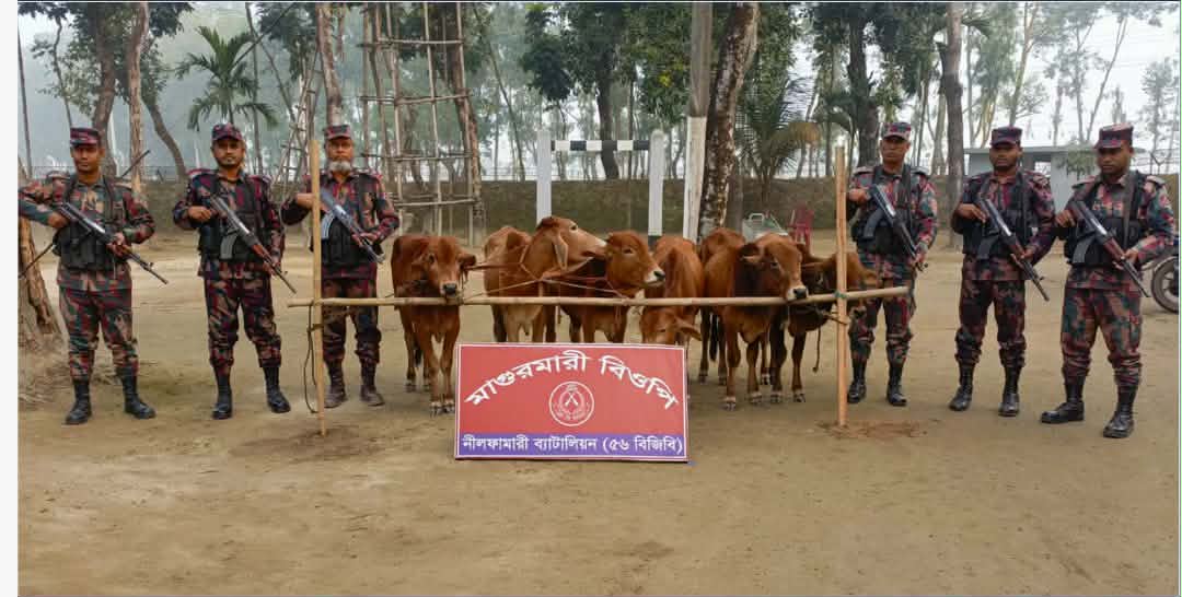 নীলফামারী প্রতিনিধি: পঞ্চগড় সীমান্ত এলাকায় চোরাচালান বিরোধী অভিযান পরিচালনা করে ৪ লাখ ২৫ হাজার টাকা মূল্যের ৬টি ভারতীয় গরু আটক করেছে বর্ডার গার্ড বাংলাদেশ (বিজিবি)। বিজিবি সূত্রে জানা যায়, ঠাকুরগাঁও সেক্টরের অধীনস্থ নীলফামারী ব্যাটালিয়ন (৫৬ বিজিবি) সীমান্ত এলাকায় অবৈধ অনুপ্রবেশ ও চোরাচালান প্রতিরোধে নিয়মিত অভিযান পরিচালনা করে আসছে। এরই ধারাবাহিকতায় রবিবার (২৫ জানুয়ারি) ভোর আনুমানিক ৩টা ১০ মিনিটে গোপন সংবাদের ভিত্তিতে পঞ্চগড় জেলার সদর থানাধীন জোতহাসনা এলাকায় অভিযান পরিচালনা করা হয়। অধিনায়ক, নীলফামারী ব্যাটালিয়ন (৫৬ বিজিবি)-এর পরিকল্পনা ও নির্দেশনায় মাগুরমারী বিওপির একটি নিয়মিত টহল দল সুবেদার মো. সেলিম মৃধার নেতৃত্বে সীমান্ত পিলার ৭৪২/১৭-এস থেকে আনুমানিক ২০০ গজ বাংলাদেশের অভ্যন্তরে জোতহাসনা (ডাকঘর-সাতমেরা, ইউনিয়ন-৬নং সাতমেরা, থানা ও জেলা-পঞ্চগড়) এলাকায় অভিযান চালায়। এ সময় ভারত থেকে বাংলাদেশে চোরাচালানের উদ্দেশ্যে আনা ৬টি ভারতীয় গরু মালিকবিহীন অবস্থায় আটক করা হয়। আটককৃত গরুগুলোর আনুমানিক বাজার মূল্য ৪ লাখ ২৫ হাজার টাকা। এ বিষয়ে নীলফামারী ব্যাটালিয়ন (৫৬ বিজিবি) জানায়, সদর দপ্তর বিজিবির নির্দেশনা অনুযায়ী দায়িত্বপূর্ণ সীমান্তে চোরাচালান প্রতিরোধে বিজিবির অভিযানিক কার্যক্রম ও গোয়েন্দা তৎপরতা অব্যাহত রয়েছে। সীমান্ত দিয়ে মাদকদ্রব্যসহ সব ধরনের চোরাচালান রোধে বিজিবি সর্বোচ্চ সতর্ক অবস্থানে রয়েছে। বিজিবি আরও জানায়, চোরাচালানের বিরুদ্ধে এ ধরনের অভিযান ভবিষ্যতেও কঠোরভাবে অব্যাহত থাকবে।