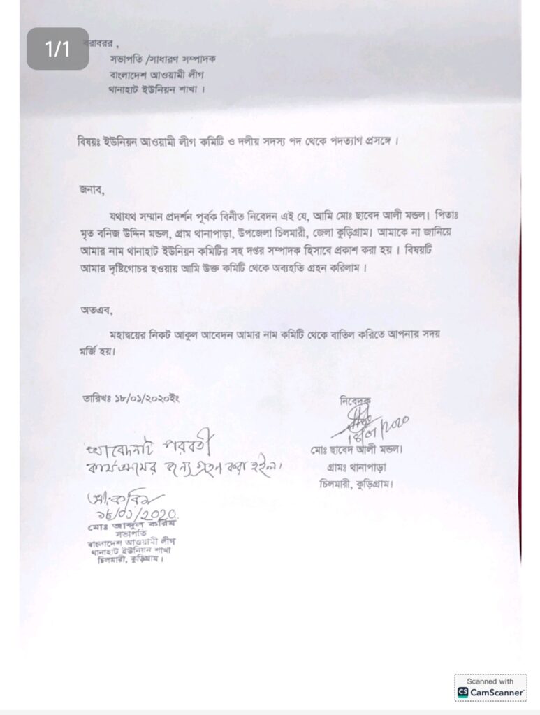 থানাহাট ইউনিয়ন আওয়ামী লীগ কমিটি থেকে স্বেচ্ছায় পদত্যাগের পর রাজনৈতিক হয়রানির মুখে পড়ার অভিযোগ তুলেছেন কুড়িগ্রামের চিলমারী উপজেলার থানাপাড়া গ্রামের মোঃ ছাবেদ আলী মন্ডল। তিনি পূর্বে ইউনিয়ন আওয়ামী লীগ কমিটির সহ-দপ্তর সম্পাদক হিসেবে তালিকাভুক্ত হন; তবে তাঁর দাবি, এ পদে অন্তর্ভুক্তির বিষয়টি তাঁকে পূর্বে জানানো হয়নি। এ ঘটনা জানার পর তিনি ২০২০ সালের ১৮ জানুয়ারি দলীয় পদ ও সদস্যতা থেকে পদত্যাগপত্র জমা দেন। পরবর্তীতে ইউনিয়ন আওয়ামী লীগের সভাপতি মোঃ আব্দুল করিম পদত্যাগপত্রটি গ্রহণ করেন।