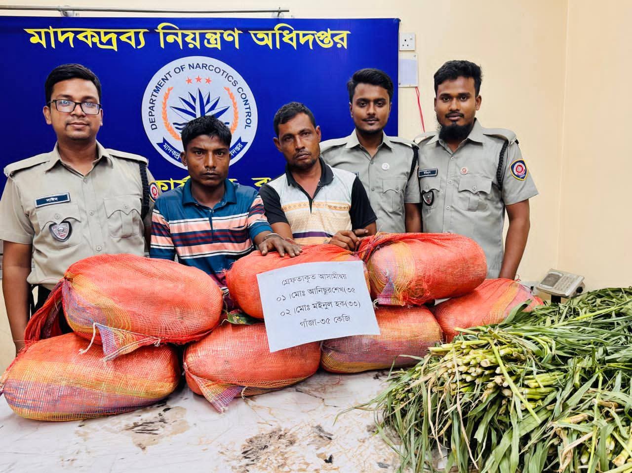 বগুড়া জেলার সোনাতলা থানাধীন বোচারপুকুর এলাকা ২৬/০৯/২০২৫ তারিখ, ৯:০০সময় , মাদকদ্রব্য নিয়ন্ত্রণ অধিদপ্তর টীম ক, জেলা কার্যালয়, বগুড়া কর্তৃক গোয়েন্দা তথ্যের ভিত্তিতে মাদকবিরোধী অভিযান পরিচালনা করে ভ্যানের উপরে ঘাসের মধ্যে বিশেষ কৌশলে পাচারকালে ৩৫ (পয়ত্রিশ) কেজি গাঁজা এবং একাজে ব্যবহৃত ১টি ইঞ্জিন ভ্যান ও তাদের ব্যবহৃত ২টি মোবাইলসহ ০২জন মাদক ১) মোঃ আনিসুর রহমান শেখ(৩৫) পিতা- মৃত চান্দু দফাদার মাতা-মোছা: আয়তন বেগম, গ্রাম- কলাকাটা হামছাপুর, শালমারা ইউপি থানা- গোবিন্দগঞ্জ , জেলা- গাইবান্ধা।(২) মো: ময়নুল হক (৩৩) পিতা: মো: মোজাহার আলী মাতা: মোছা: মনোয়ারা বেগম গ্রাম- শালমারা, মিরাপাড়া, শালমারা ইউপিথানা: গোবিন্দগঞ্জ, জেলা: গাইবান্ধা। পাচারকারীকে গ্রেফতার করা হয়।
