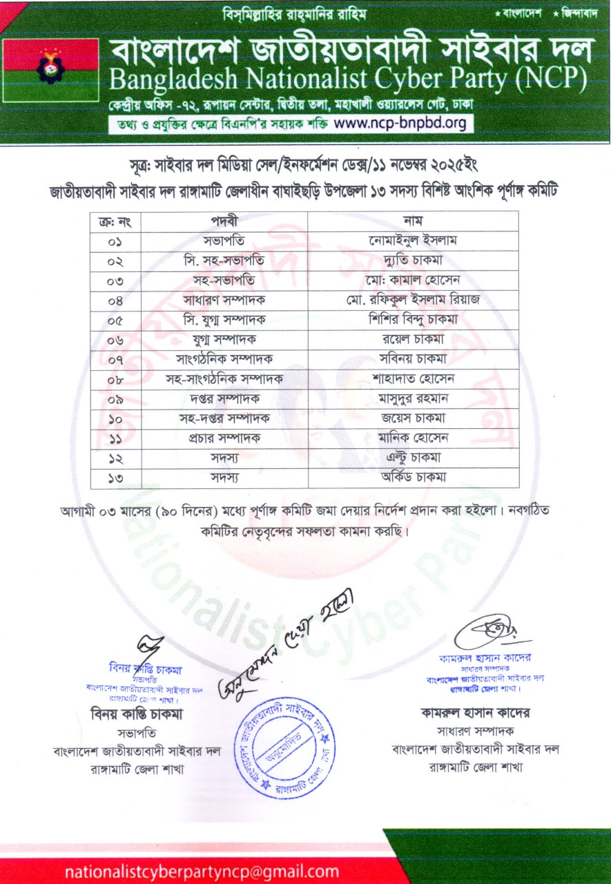 বাংলাদেশ জাতীয়তাবাদী সাইবার দল বাঘাইছড়ি উপজেলা ও পৌর শাখার কমিটি অনুমোদন
