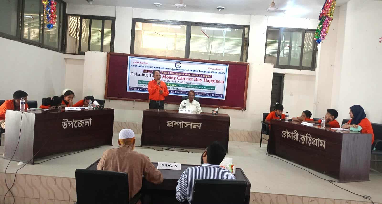 রৌমারী(কুড়িগ্রাম) প্রতিনিধি: “ইংরেজি শিখো – বাংলা সমৃদ্ধ করো” এই প্রতিপাদ্যকে সামনে রেখে রৌমারী উপজেলায় বিভিন্ন আয়োজনের মধ্য দিয়ে ইংলিশ ল্যাংগুয়েজ ক্লাবের ১০তম প্রতিষ্ঠা বার্ষিকী পালিত হয়েছে। ২৫ অক্টোবর শনিবার সকাল ১০টায় উপজেলা হলরুমে থেকে একটি বর্ণাঢ্য র্যালি বের হয়ে উপজেলা শহরের প্রধান প্রধান সড়ক প্রদক্ষিণ করে একই স্থানে এসে শেষ হয়। পরে রৌমারী মহিলা কলেজের সহকারি অধ্যাপক এমএ ছামাদ খাঁন এর সভাপতিত্বে এক আলোচনা সভা অনুষ্ঠিত হয়। অনুষ্ঠানে বক্তব্য রাখেন,বীর মুক্তিযোদ্ধা খন্দকার শামসুল আলম, উপদেষ্টা, রৌমারী সরকারী কলেজের সহকারি প্রভাষক আঞ্জুমান আরা,মোঃ মনছের আলী,সিনিয়র প্রভাষক রৌমারী মহিলা ডিগ্রী কলেজ, আকতারুজ্জামান সিনিয়র প্রভাষক রৌমারী মহিলা ডিগ্রী কলেজ, ফরিদ উদ্দিন সিনিয়র প্রভাষক যাদুরচর মডেল কলেজ,রৌমারী কেরামতিয়া আর্দশ ফাজিল মাদ্রাসার সহকারী শিক্ষক মাহমুদা আক্তার স্মৃতি,হারুন অর রশিদ অবসরপ্রাপ্ত প্রদর্শক রৌমারী সরকারী কলেজ ,রৌমারী মডেল সরকারি প্রাথমিক বিদ্যালয়ের প্রধান শিক্ষক রেজাউল করিম রিজু,সমাজ কর্মী এস,এম,এ মোমেন সমাজকর্মী মহির উদ্দিন মহির প্রমুখ।বিভিন্ন জাতীয় দৈনিক পত্রিকার সাংবাদিকবৃন্দ উপস্থিত ছিলেন। আলোচনা সভা শেষে দু’ গ্রুপের মধ্যে “টাকায় সুখ কেনা যায় না” বিষয়ে বিতর্ক প্রতিযোগীতা অনুষ্ঠিত হয়,এতে অংশ গ্রহন করেন ইংলিশ ল্যাংগুয়েজ ক্লাবের সকল সদস্যবৃন্দ। মডারেটরের দায়িত্ব পালন করেন রৌমারী সরকারী কলেজের অবসরপ্রাপ্ত অধ্যাপক আব্দুল আউয়াল,বিচারক হিসাবে দায়িত্ব পালন করেন শফিকুল ইসলাম সিনিয়র প্রভাষক ফরহান আলী ,সিনিয়র প্রভাষক যাদুরচর ডিগ্রী কলেজ। অনুষ্ঠানটি সঞ্চালনা করেন ল্যাংগুয়েজ ক্লাবের প্রতিষ্ঠাতা মোস্তাফিজুর রহমান ফেরদৌস ও হারূন অর রশিদ তুহিন পরে বিজয়ীদের মাঝে পুরুস্কার বিতরণ করা হয়।